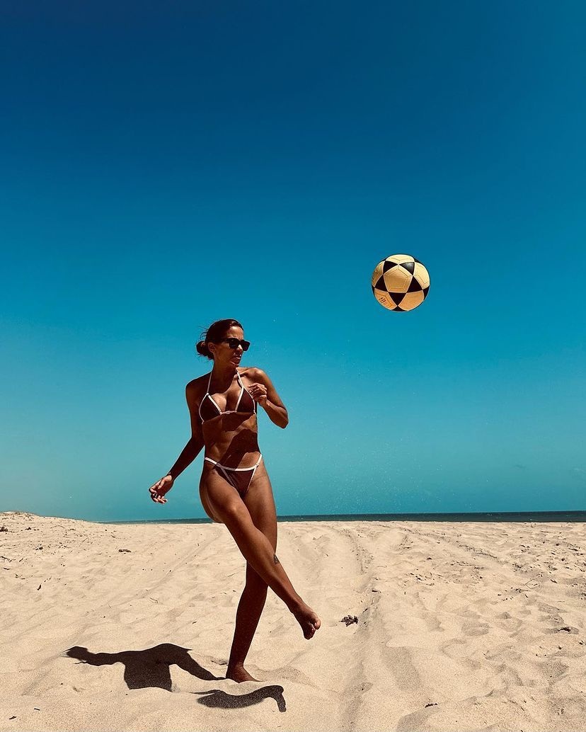 A cantora Anitta postou em suas redes sociais, neste sábado (28), fotos curtindo as delícias do litoral cearense. De biquíni, renovando o bronzado e batendo uma bolinha na praia, a “girl from Rio” se prepara para participação no Aviões Fantasy, que ocorre hoje na Arena Castelão. Nos últimos dias, também por estas bandas, a carioca também marcou presença na gravação do DVD do grupo Menos é Mais.