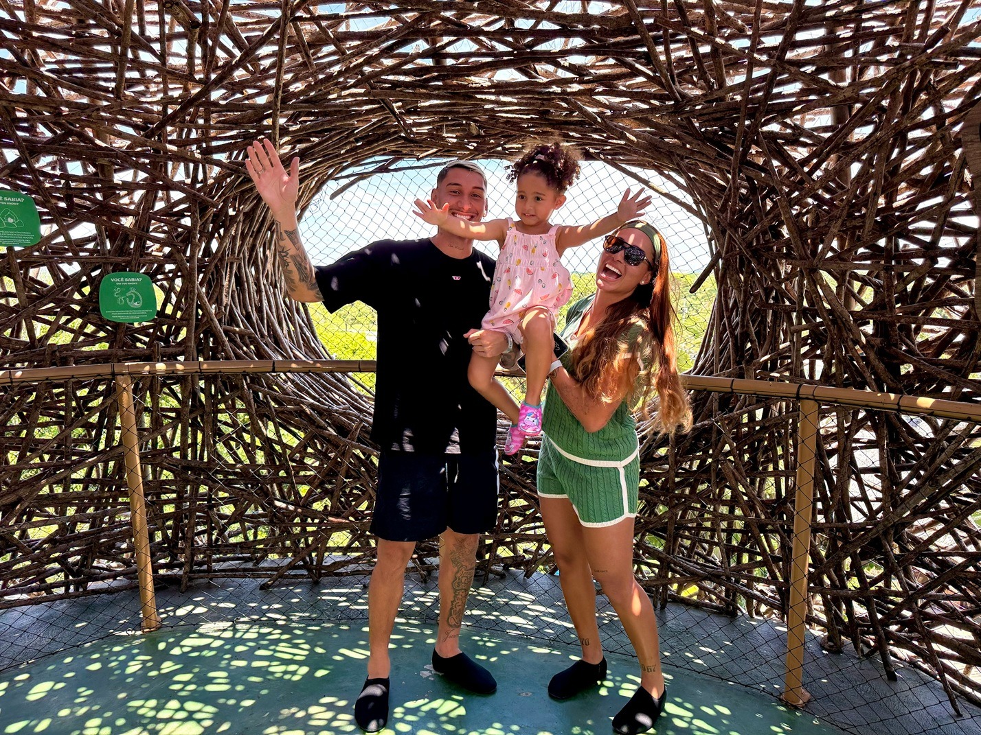 Cercada por áreas verdes e atrações interativas, Lomma explorou o Parque Arvorar através de ambientes que estimulam a curiosidade e o aprendizado de forma leve, acompanhando de perto a filha enquanto ela descobria e brincava nas atrações. O espaço é pensado para proporcionar uma experiência imersiva em meio à natureza, por isso, o grupo conheceu algumas atrações especiais: começando pela Casa do Passarim, uma casa na árvore com quatro andares e vista panorâmica 360 graus; o Arvorão, circuito de trilhas aéreas com escorregadores e passarelas suspensas entre as copas das árvores; e o Redão, grande redário suspenso que convida visitantes de todas as idades a brincar e relaxar. O roteiro incluiu ainda a visita aos três aviários do parque, onde é possível observar de perto diversas espécies de aves, incluindo animais ameaçados de extinção, proporcionando uma experiência sensorial e educativa que despertou ainda mais a curiosidade da criança.