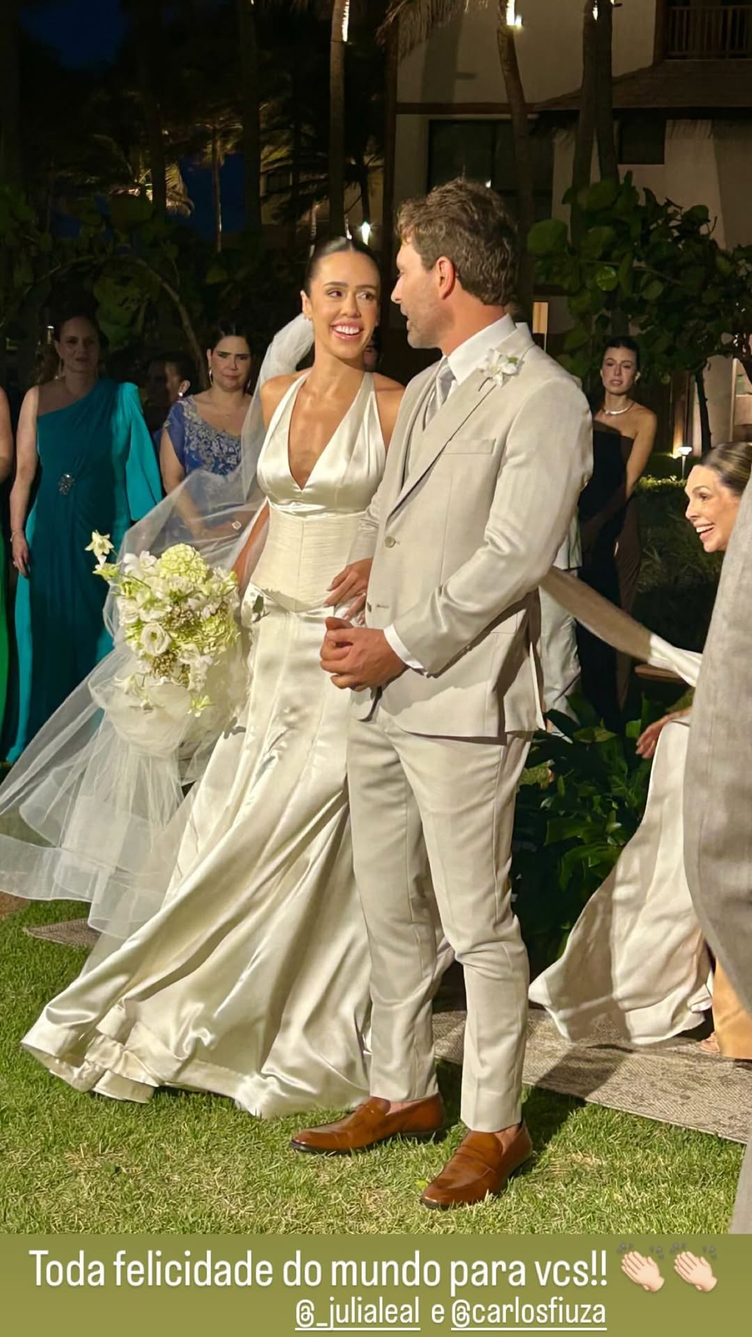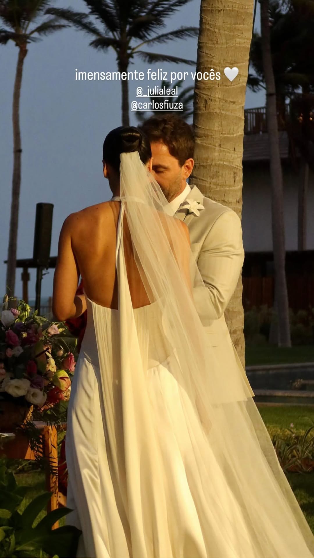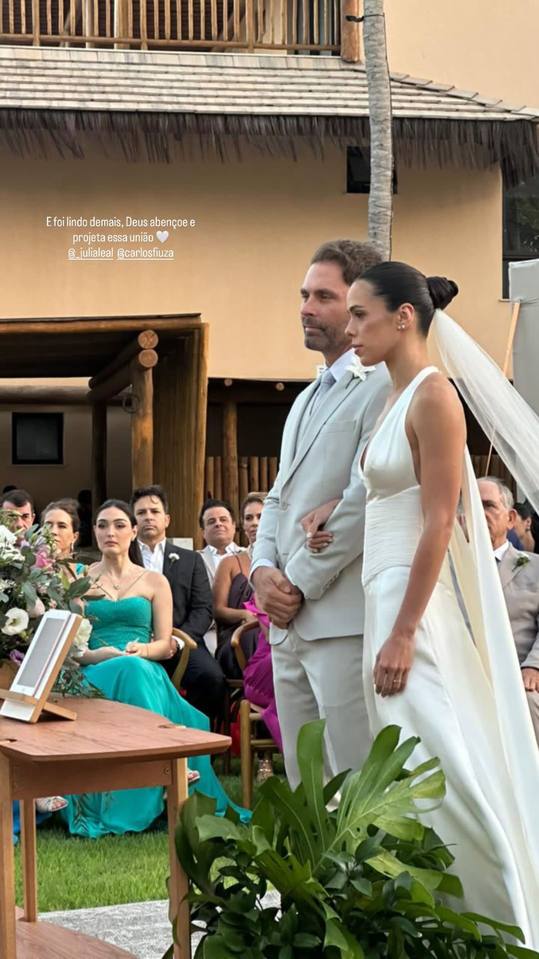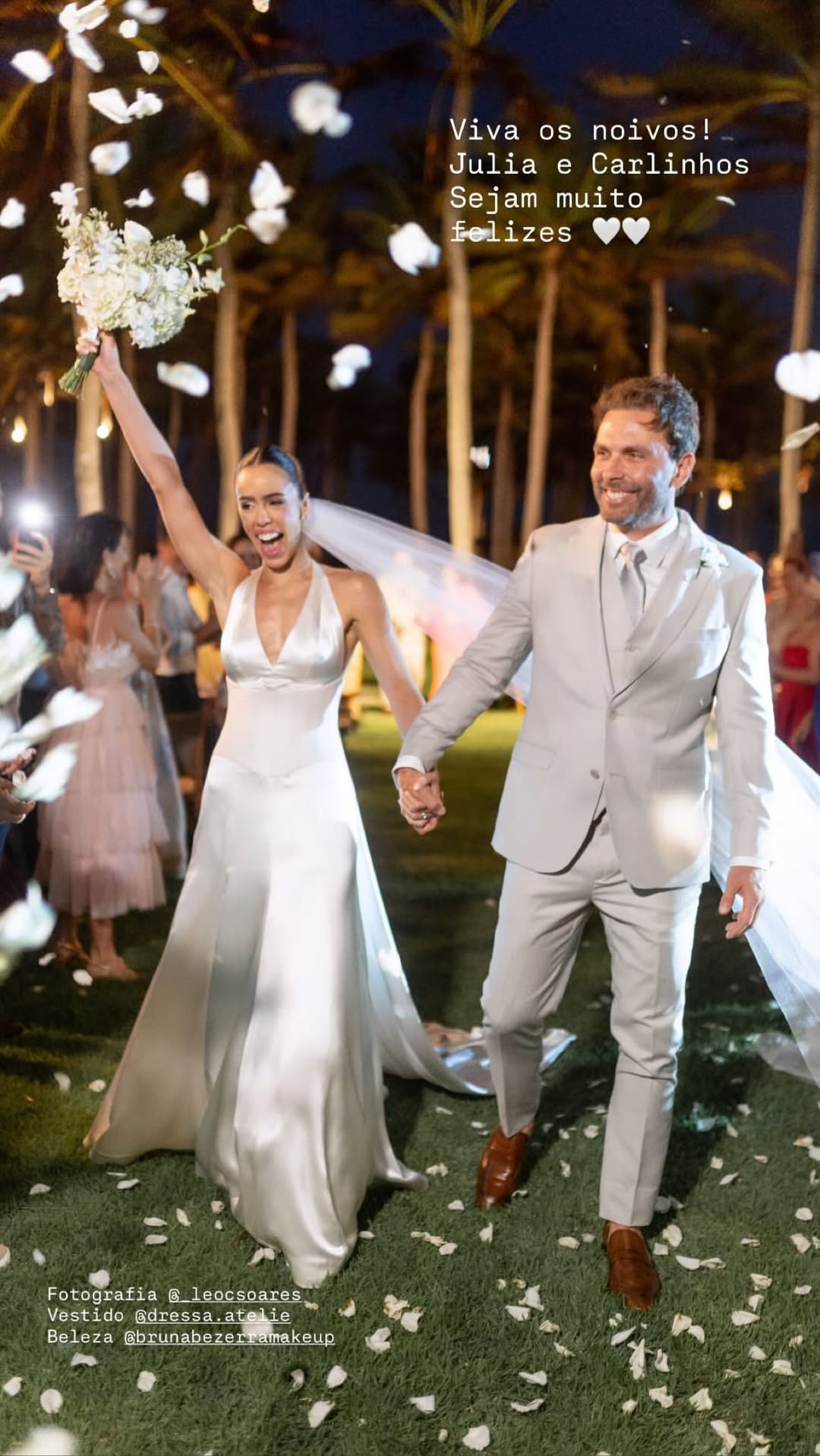 Júlia Leal e Carlos Fiuza celebraram união em uma cerimônia ao ar livre repleta de elegância e romantismo, realizada no Fortim. O casamento, à beira-mar e em meio a palmeiras, teve como cenário o pôr do sol e o brilho das luzes, que tornaram o momento ainda mais encantador. A noiva deslumbrou com um vestido de cetim branco com decote halter e cauda fluida, exalando leveza e sofisticação. O noivo, por sua vez, escolheu um terno em tom claro, em perfeita sintonia com o clima praiano e o estilo da celebração.