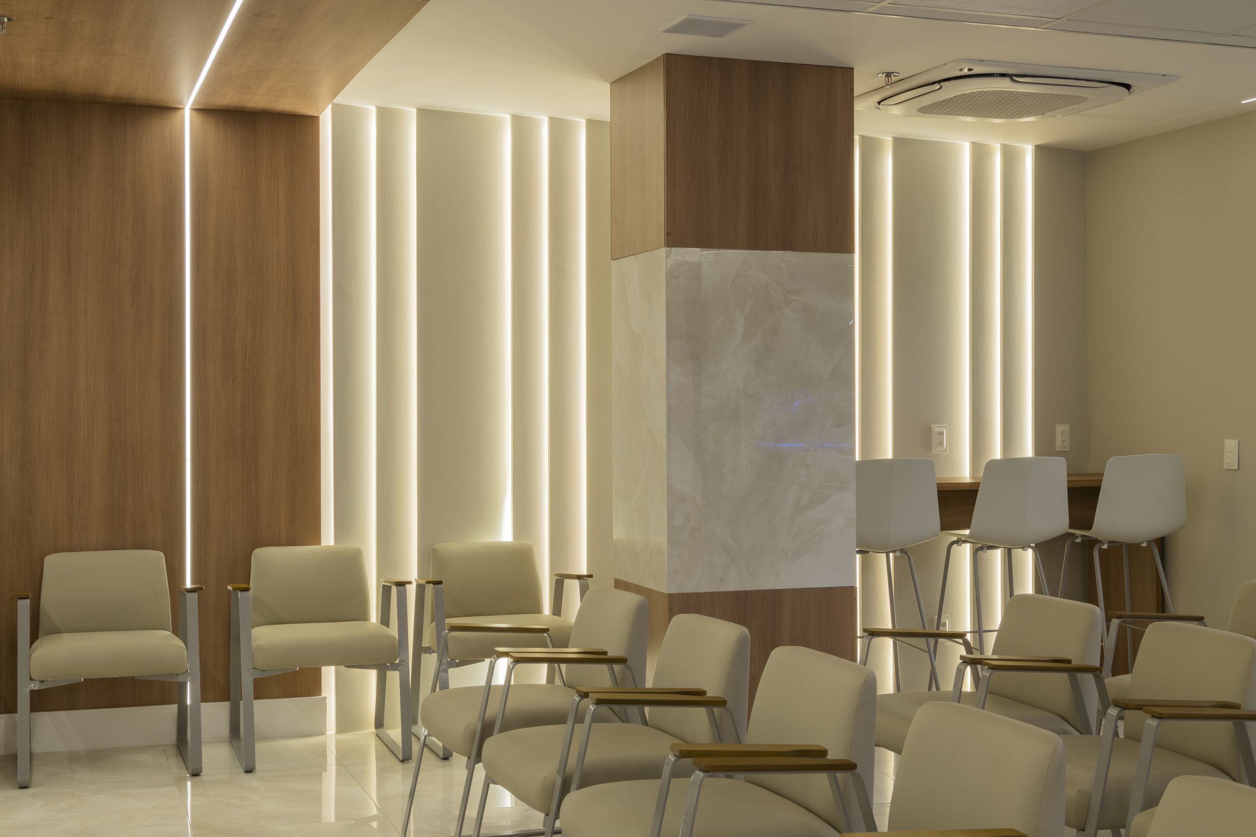As cadeiras são essenciais para o conforto do paciente e do médico, além de trazerem um design leve e atraente. Nas áreas comuns é a iluminação que conduz o espaço. Foi utilizada como elemento decorativo e de destaque desde as recepções, onde perfis led “sobem” nas paredes, invadem o forro e o balcão, até às circulações onde o grande painel escultórico cria um ritmo com iluminação indireta refletida no piso, quebrando a monotonia do longo percurso.