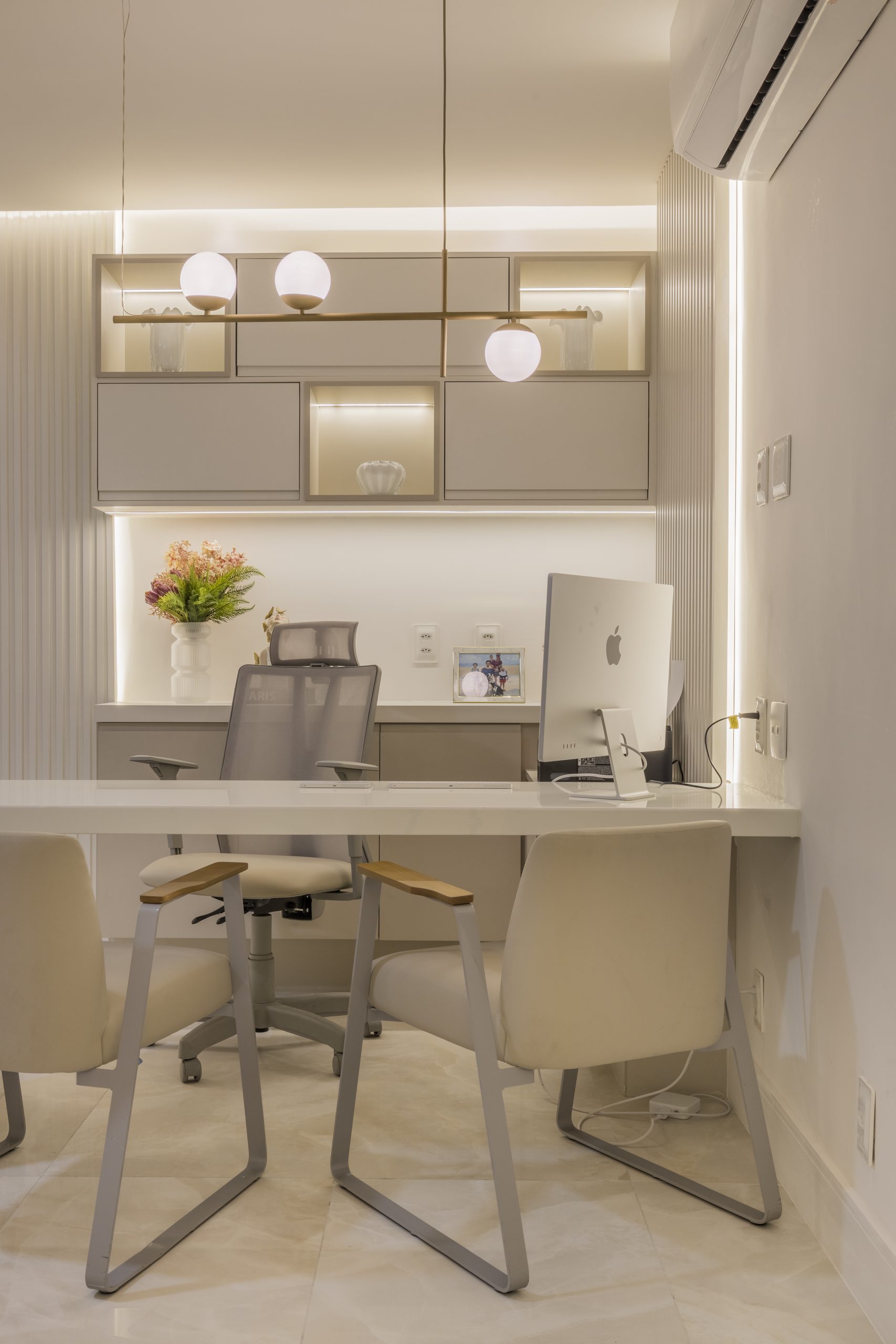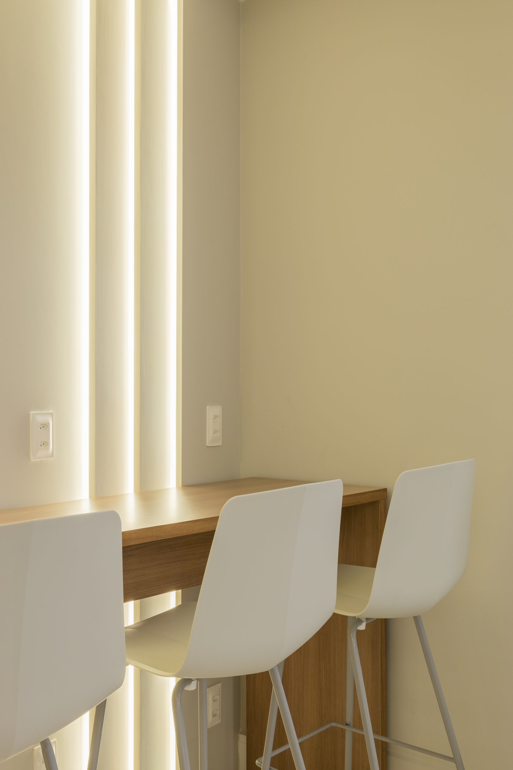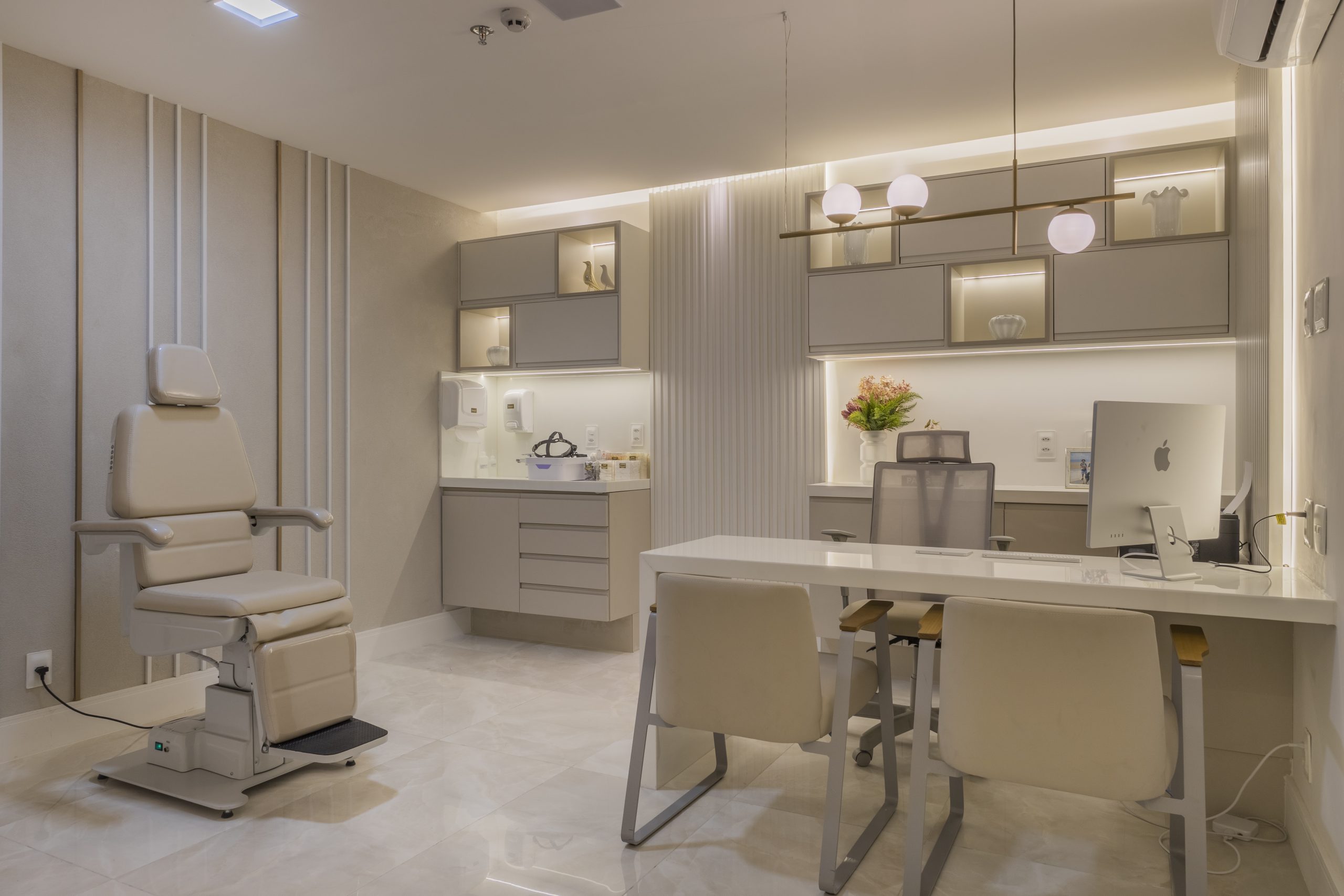 Os quatro consultórios de Estética e os oito de Otorrino recebem uma ambientação inspirada em um estilo contemporâneo, com tons suaves e destaques em perfis metálicos no tom dourado além dos painéis ripados. O toque de sofisticação é complementado pela decoração inserida nos nichos e pela iluminação cuidadosamente trabalhada com pendente dourado e cúpulas redondas em vidro leitoso, além da iluminação geral indireta no forro e mobiliário e pontual onde interessa.
