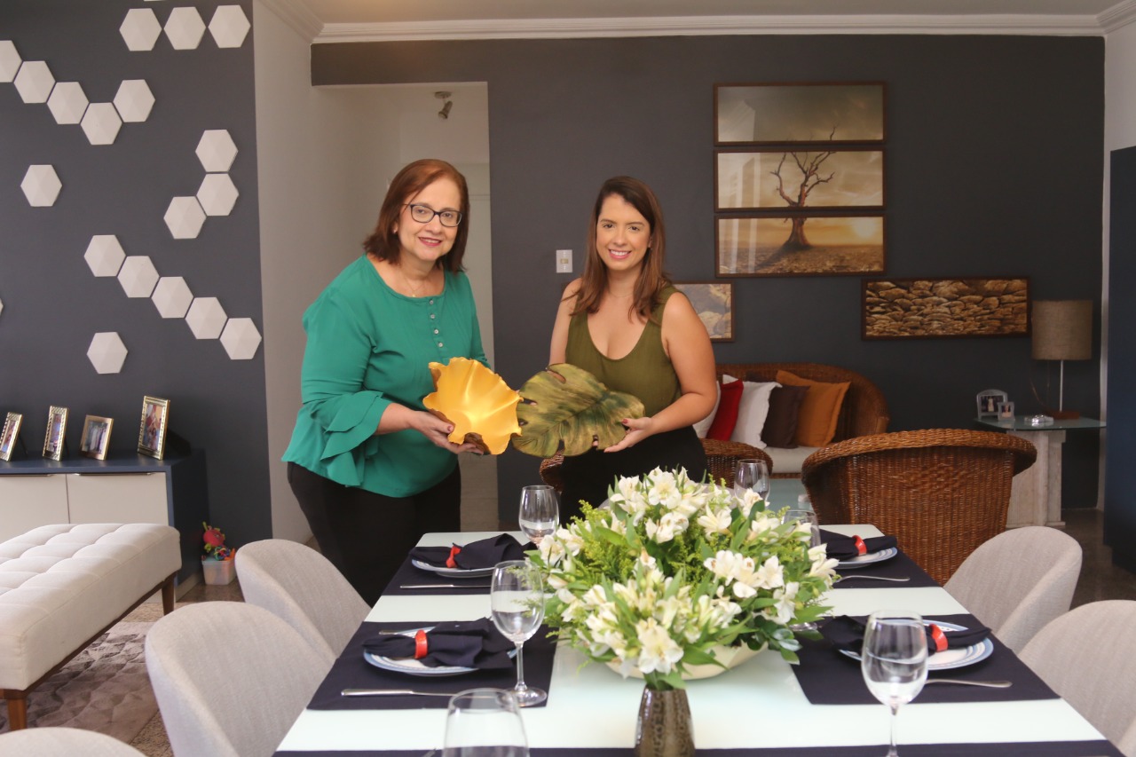 Dentre os irmãos, Lucilene Cavalcante, 57, foi a que mais absorveu a cultura de elaborar belas mesas postas para acompanhar almoços e jantares, prática aprendida com o pai. O costume virou tradição que acompanha seus 34 anos de casada, inspirando também a filha, Jamille Cavalcante, 29, a criar um apreço por este universo. Embora tenham trilhado caminhos diferentes durante muito tempo, sendo a mãe pela pedagogia e a filha pela arquitetura e urbanismo, ambas decidiram, há cerca de três anos, se lançar ao desconhecido, empreendendo justamente no ramo já tradicional no seio familiar. Juntas, criaram a marca Arte com Mesa Posta, que, além dos itens convencionais, aposta também em peças em cerâmica, confeccionadas pela própria arquiteta, para compor uma mesa.