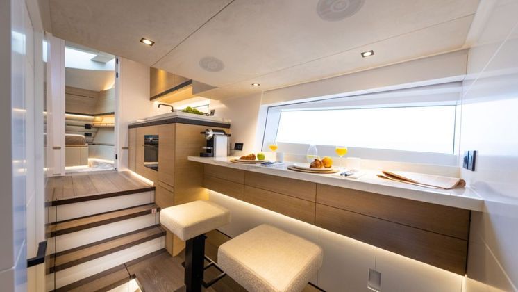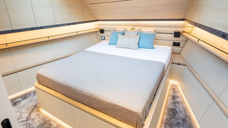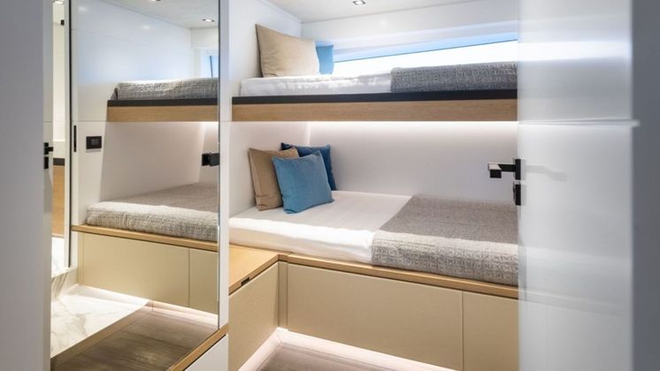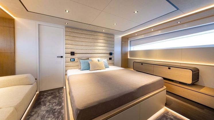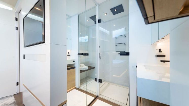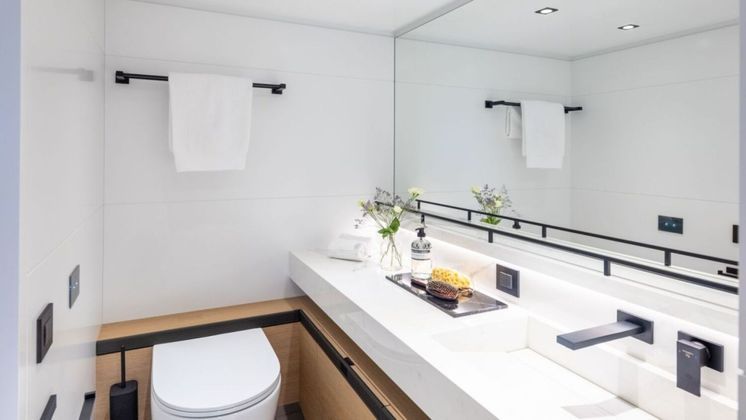 No meio do navio, está localizada uma suíte master, com 5 metros de largura. Além da cama de casal, há um espaço com sofá, cômoda e janela com vista para o mar. Todas os quartos contam com banheiro feito de materiais e pedras de luxo.