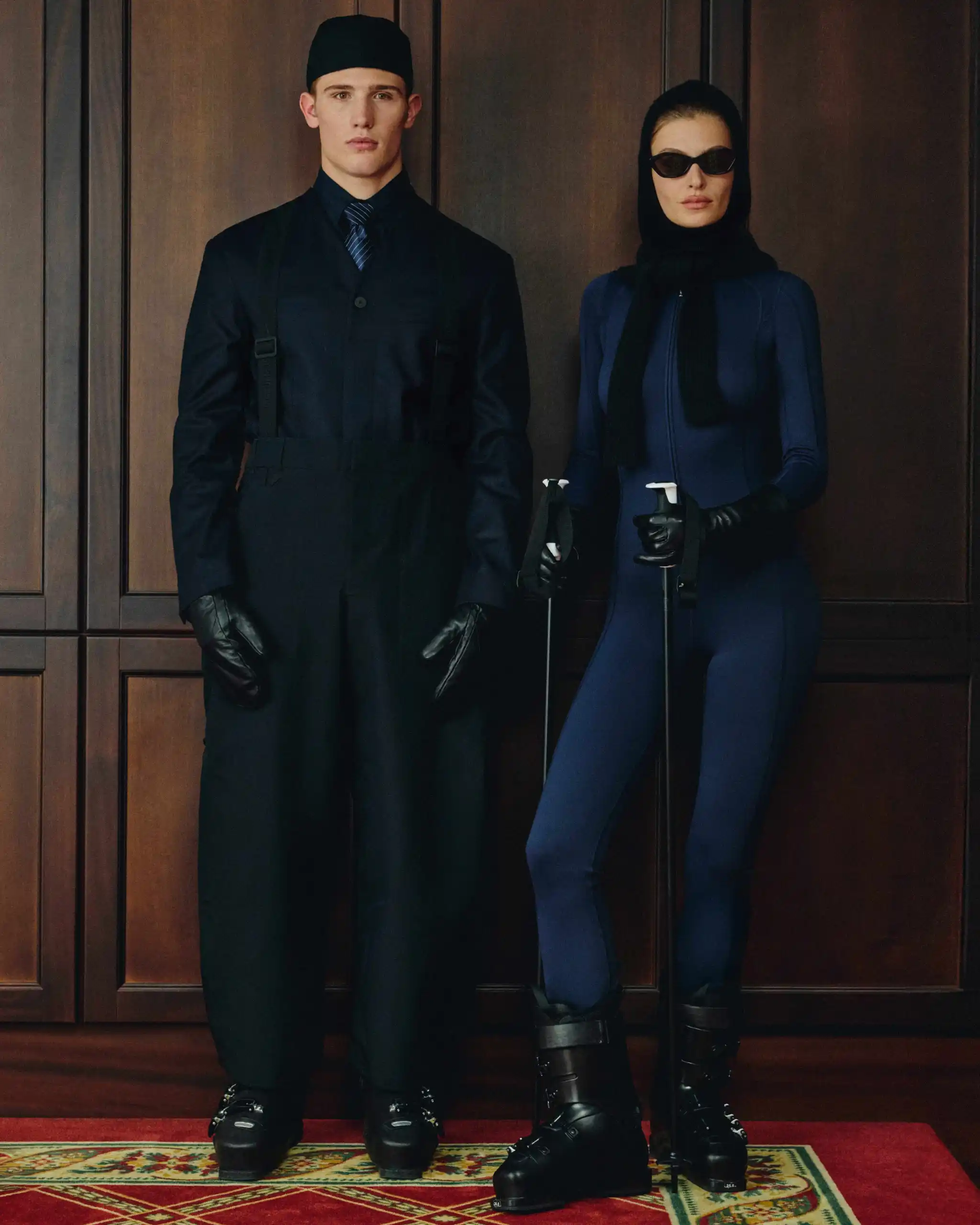 Além das peças femininas — que incluem um bralette e um macacão tecido em material elástico e repelente à água — e das opções masculinas com tecidos impermeáveis, a coleção ganha um desdobramento especial: uma parceria com a marca francesa Lacroix. Juntos, criaram um par de esquis listrados em laranja e preto, além de uma máscara combinando, disponíveis a partir de 1º de dezembro.