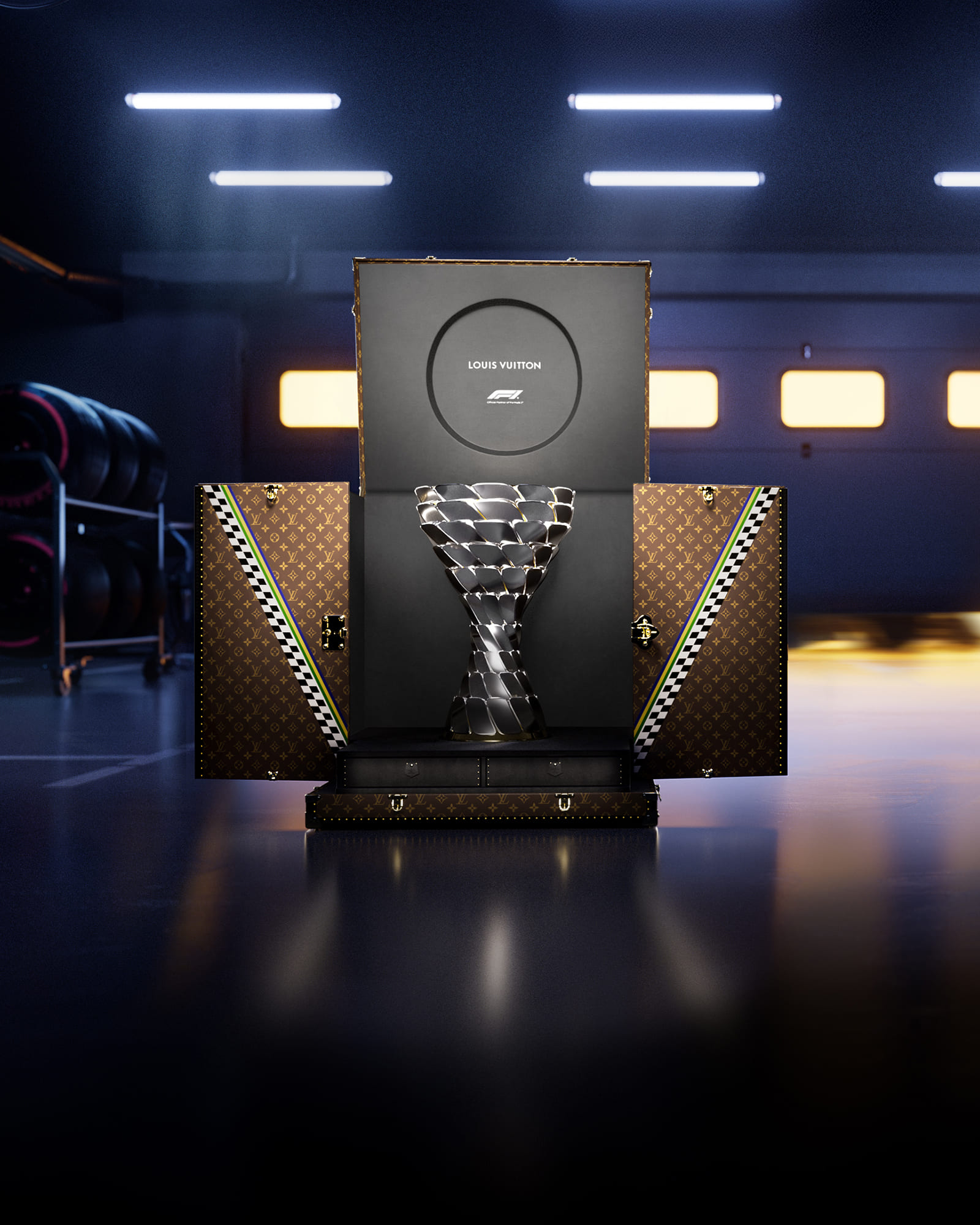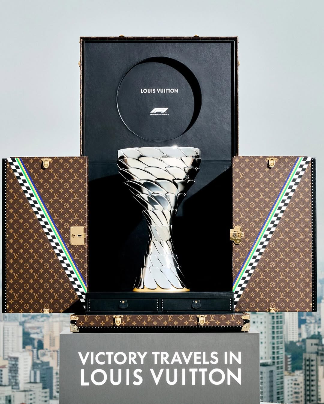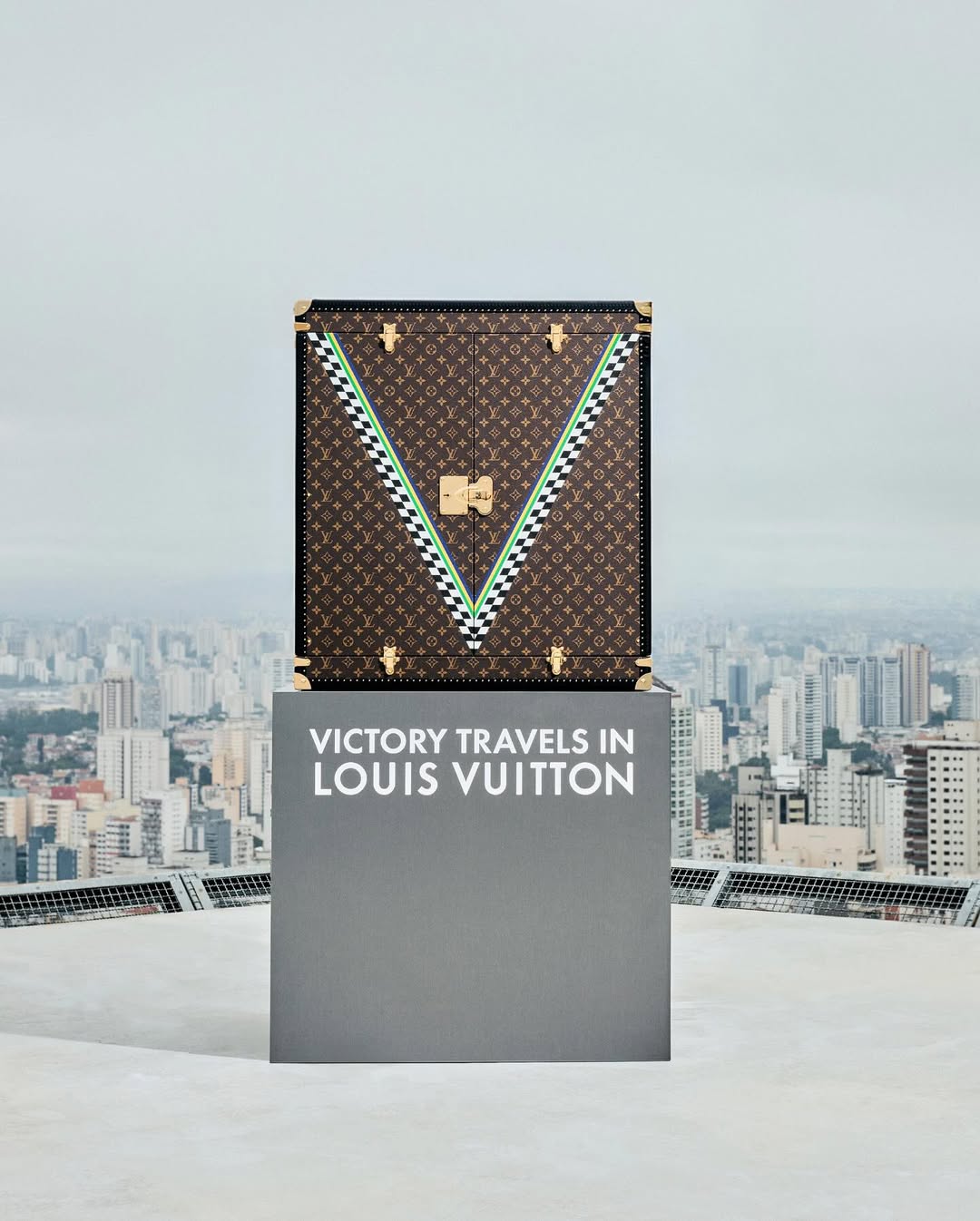 A Louis Vuitton apresentou o Louis Vuitton Trophy Trunk, baú criado sob medida para transportar o troféu do GP de São Paulo de Fórmula 1, que será realizado entre os dias 7 e 9 de novembro, no Autódromo José Carlos Pace. Produzida no histórico ateliê da maison em Asnières, na França, a peça exibe o icônico Monograma LV, adornado com a letra “V” — de Vitória e Vuitton — em tons de verde, azul e amarelo, combinados ao preto e branco, referência à tradicional linha de chegada das pistas de corrida.