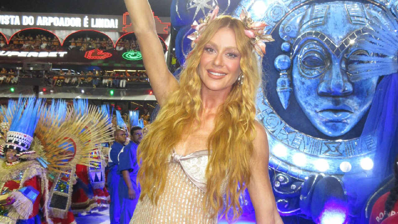Para a noite de folia, Marina construiu uma proposta etérea, descrita por ela nas redes sociais como inspirada em uma estética de “fada”. O styling foi finalizado com sandálias de plataforma transparente e um adereço floral nos cabelos. Os fios ruivos apareceram soltos, com ondas volumosas e textura cacheada, valorizando o romantismo do visual.