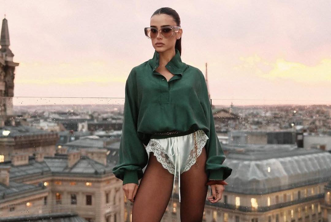 Enquanto Paris respira a Semana de Alta-Costura, Livia Nunes roubava a cena no desfile menswear da Saint Laurent. Única brasileira convidada para a apresentação, a it-girl surgiu com uma proposta que equilibra sensualidade e elegância: a combinação de seda verde e cetim com rendas aparentes. O visual, arrematado por um cinto de corrente dourada e óculos imponentes, reflete a estética apurada que a tornou uma das favoritas de Anthony Vaccarello.