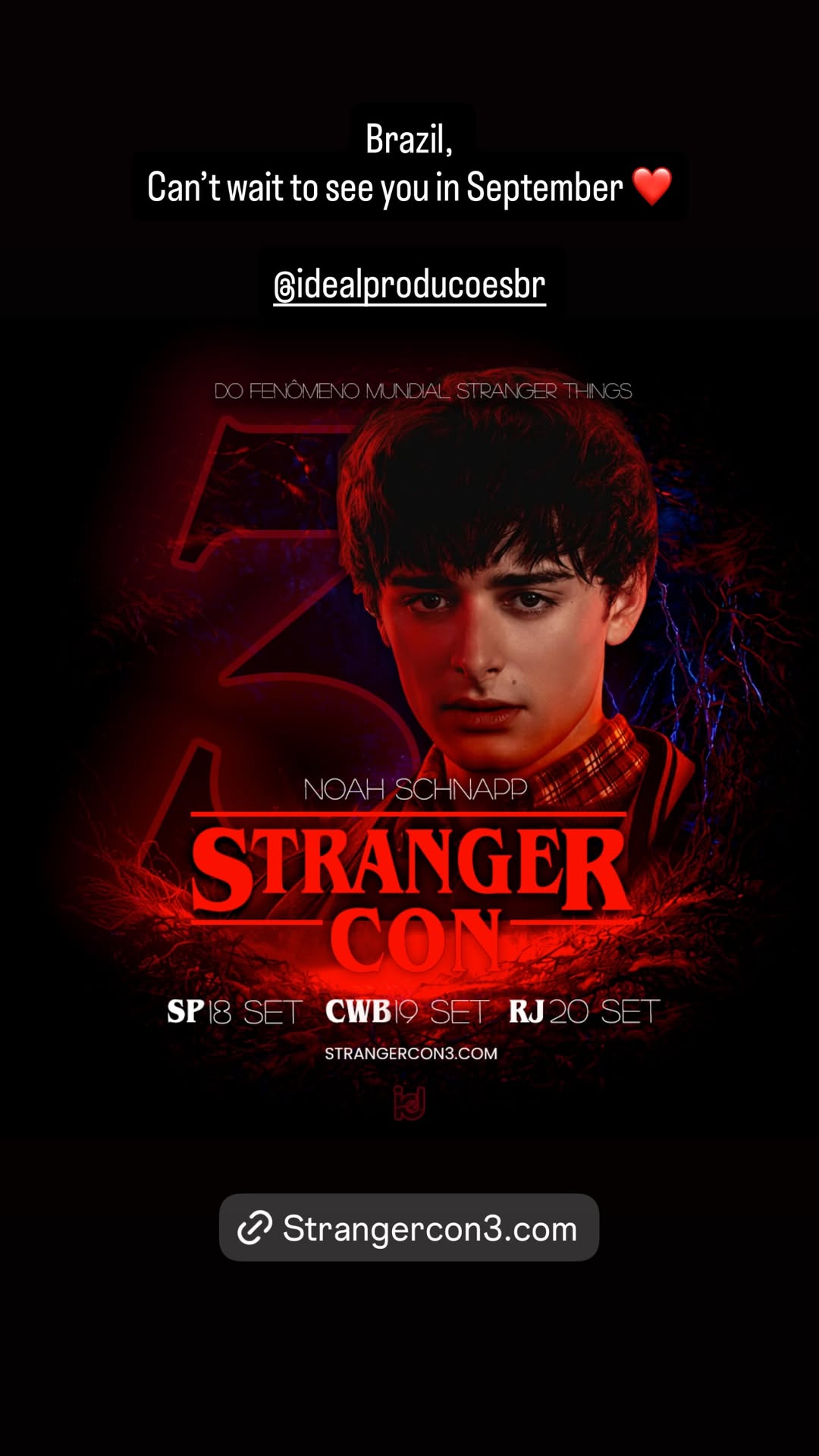 Os fãs brasileiros de Stranger Things já podem comemorar. O ator Noah Schnapp, intérprete de Will Byers, confirmou nesta segunda-feira (19) que desembarca no país em setembro para participar da Stranger Con. Com uma mensagem direta em suas redes sociais — “Brasil, eu mal posso esperar para ver vocês” —, o astro anunciou que passará por três capitais: São Paulo (18/09), Curitiba (19/09) e Rio de Janeiro (20/09). O evento promete encontros exclusivos e painéis com o ator, que é um dos nomes mais queridos do elenco da série da Netflix.
