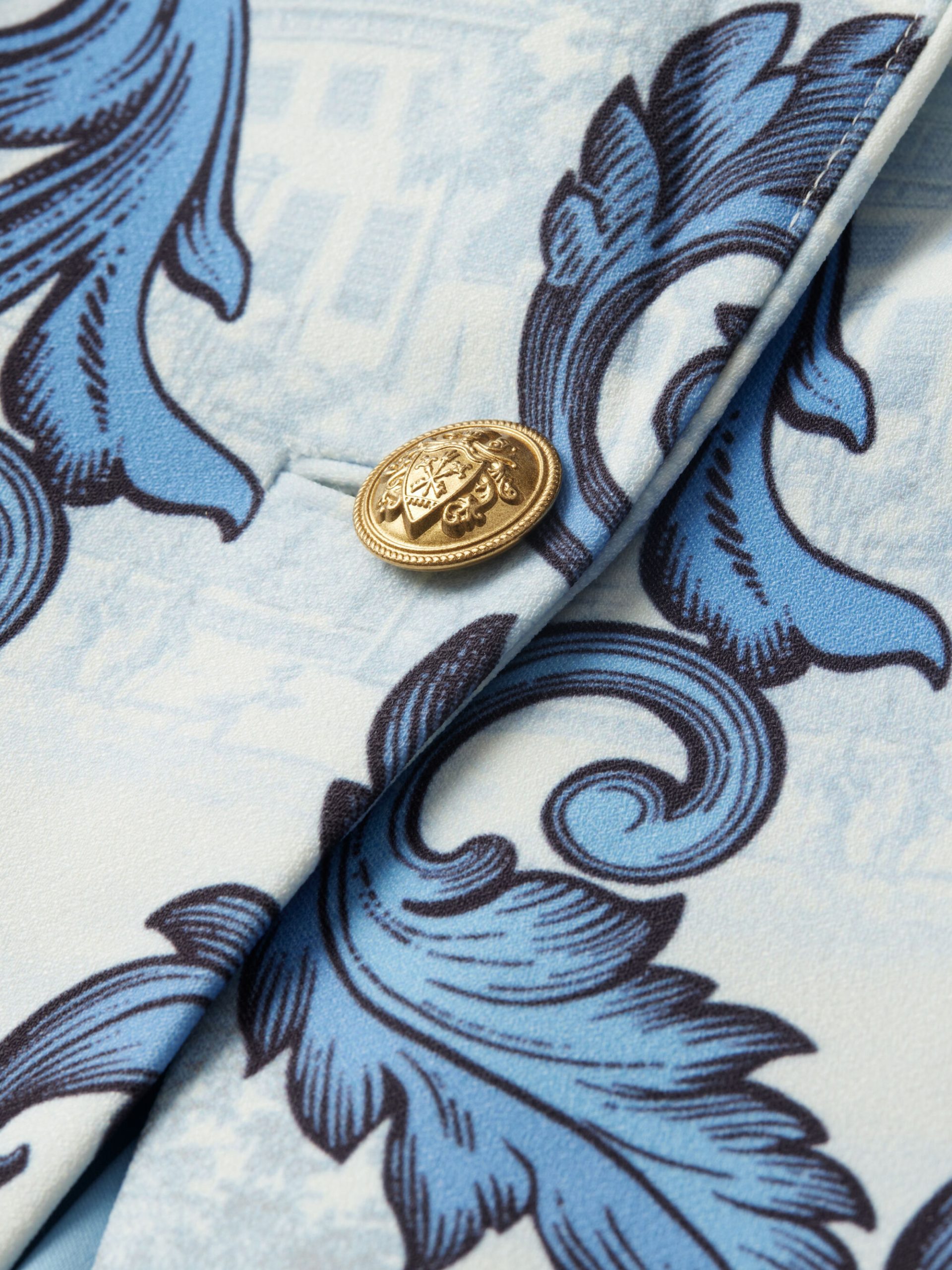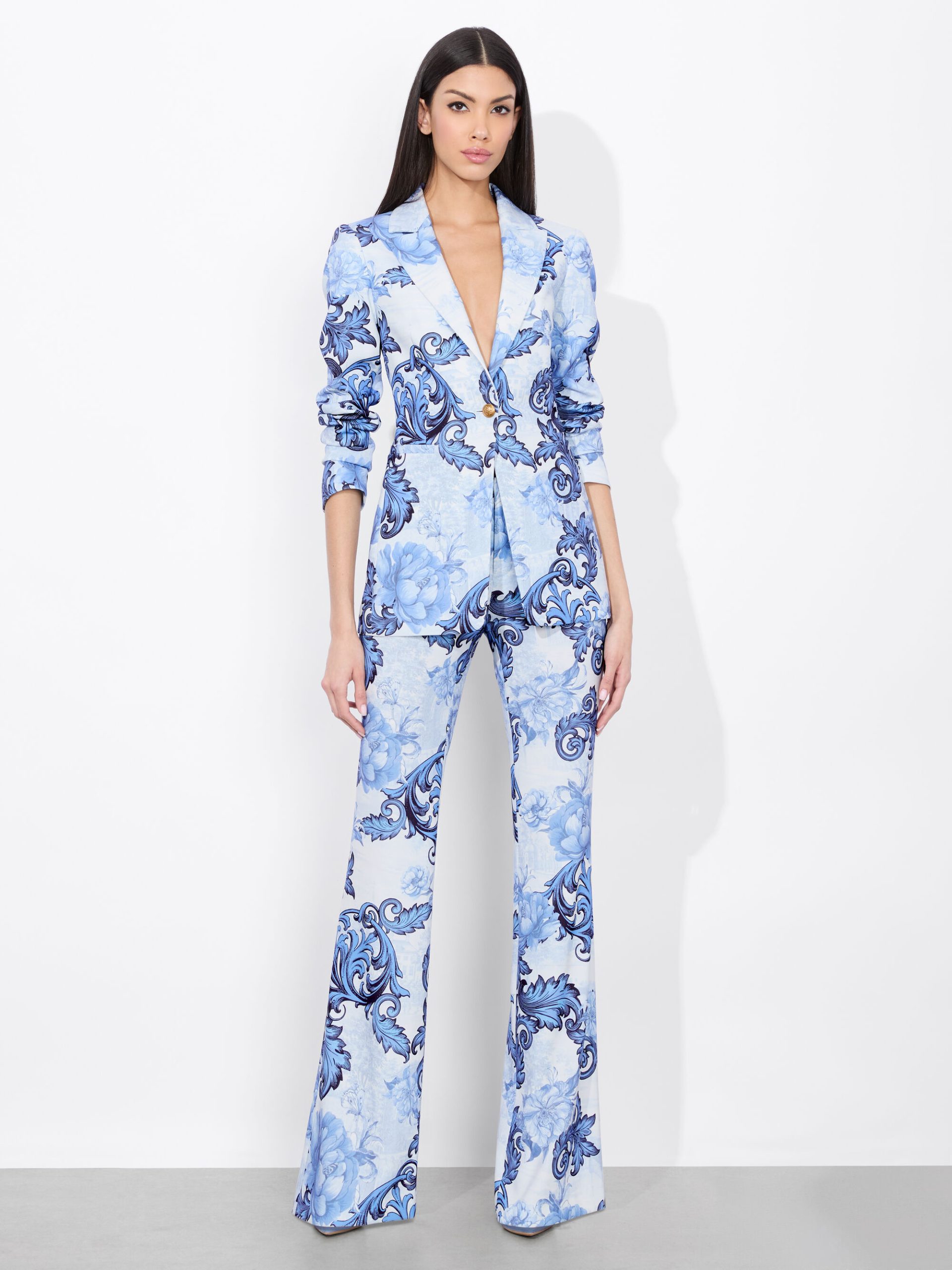 O valor mencionado corresponde apenas ao blazer, que foi combinado com uma calça de alfaiataria alinhada à mesma proposta sofisticada. A socialite optou por usar uma camiseta, uma calça e uma faixa no pescoço com a mesma estampa, deixando o blazer aberto e criando um contraste casual com a estrutura da peça.