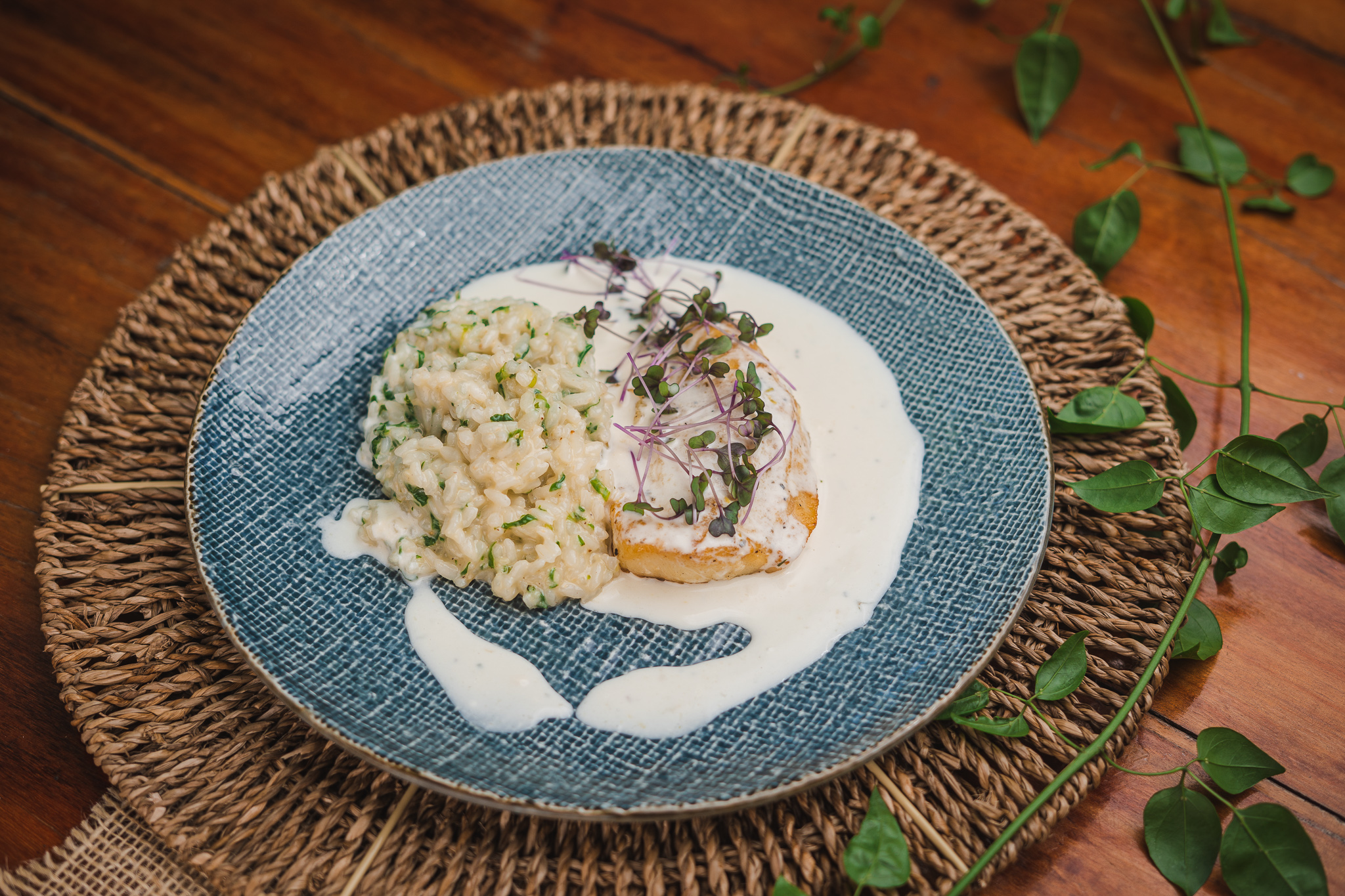 FILETTO: Filé de sirigado com molho de limão siciliano acompanhado de risoto de espinafre.