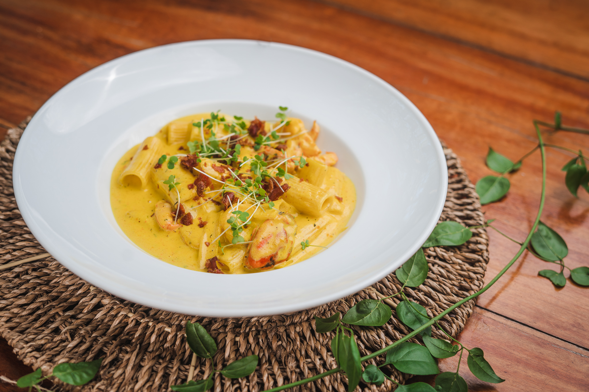 FRUTTI DI MARE: Massa tipo rigatoni grano duro italiano com camarões, mexilhões meia concha e molho à base de creme de leite fresco com toque de limão siciliano, finalizado com crocante de Parma.