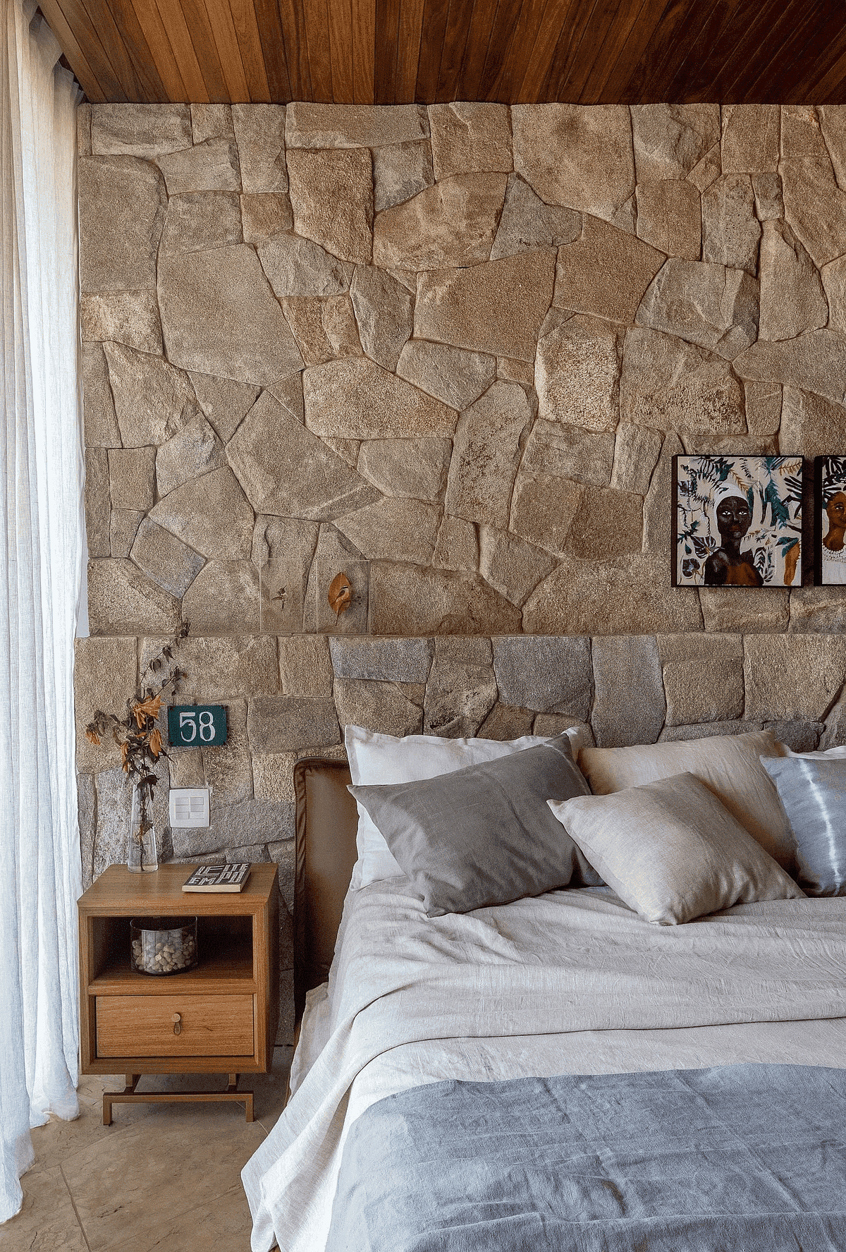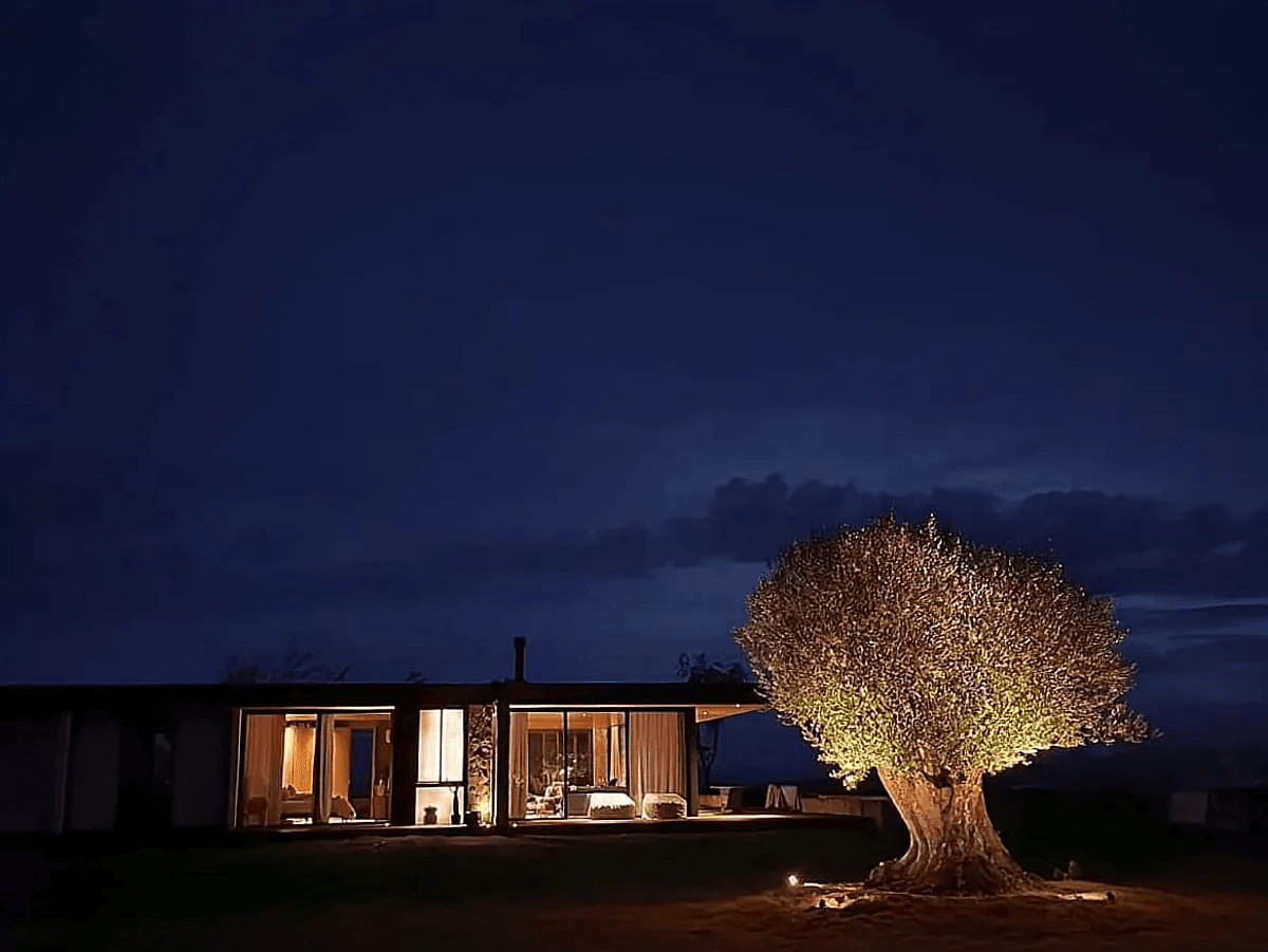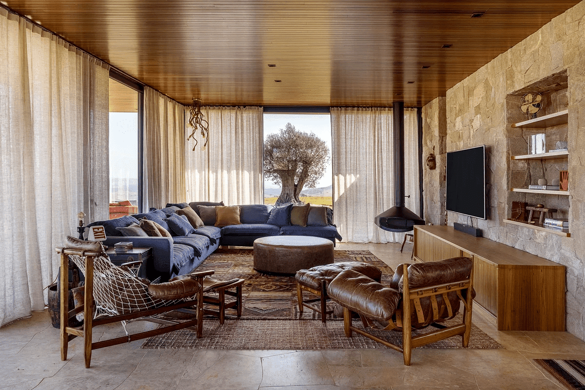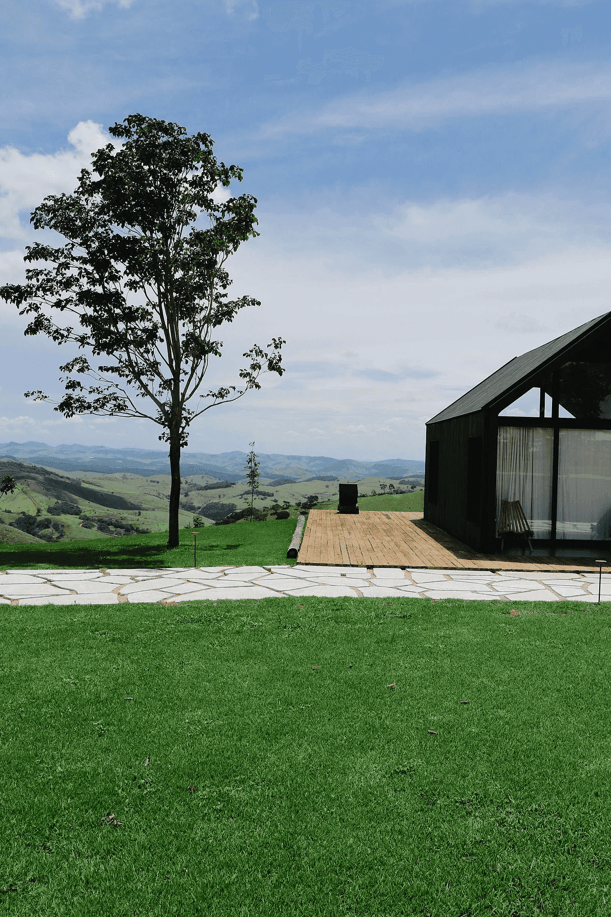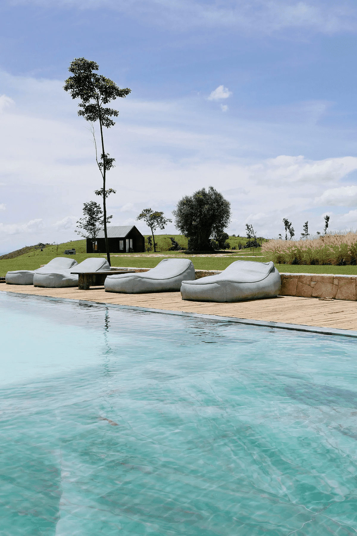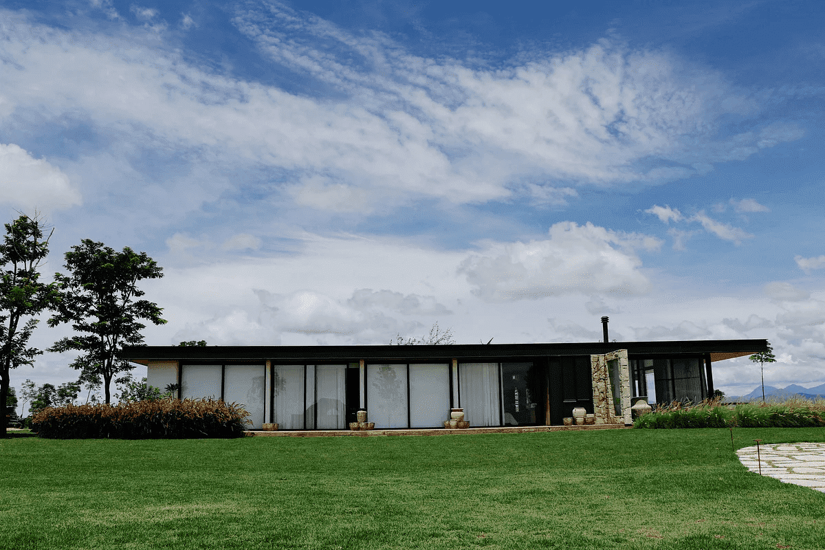 A Casa Principal possui sala de jantar e cozinha integradas e sete suítes, sendo uma delas para crianças. O projeto externo ainda inclui duas cabanas com uma suíte cada; já a sétima suíte é na Casa Pedra, que fica mais reservada. Além disso, há lagos, piscina com móveis assinados por Nanni Chinellato e uma área gourmet com forno a lenha, quadra de beach tennis, mesa de ping pong e um grande balanço para completar a área de lazer e entretenimento.