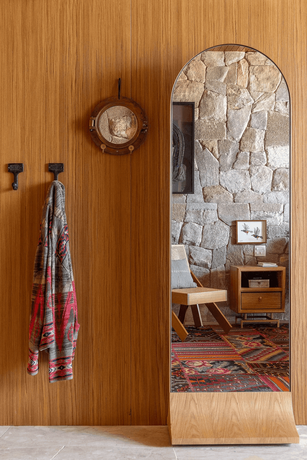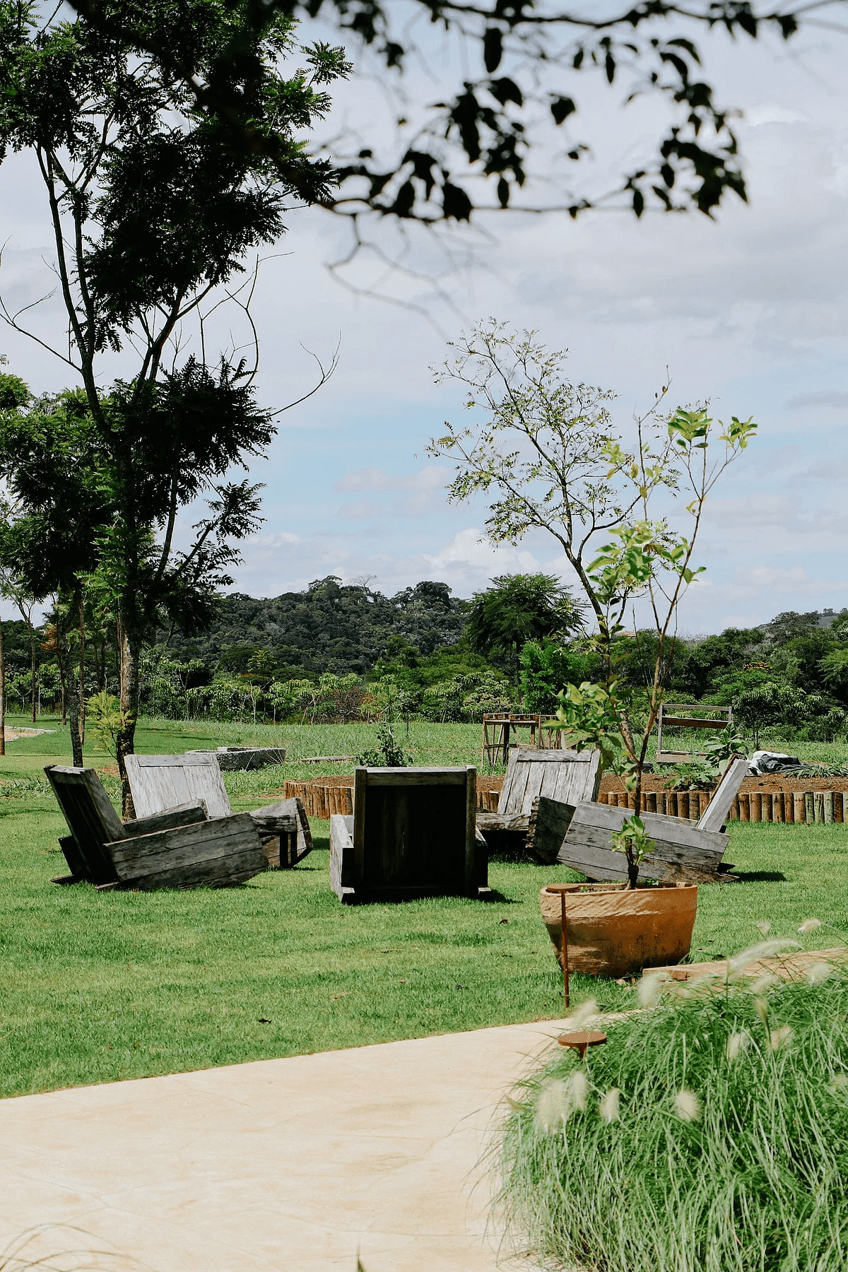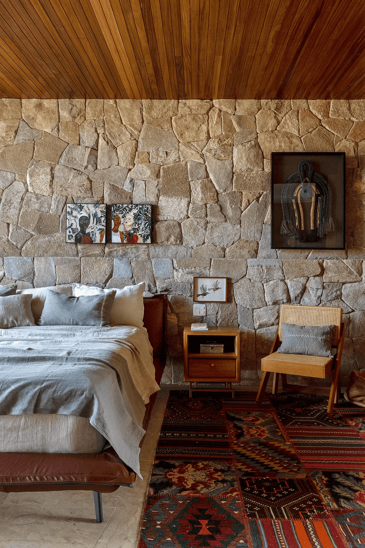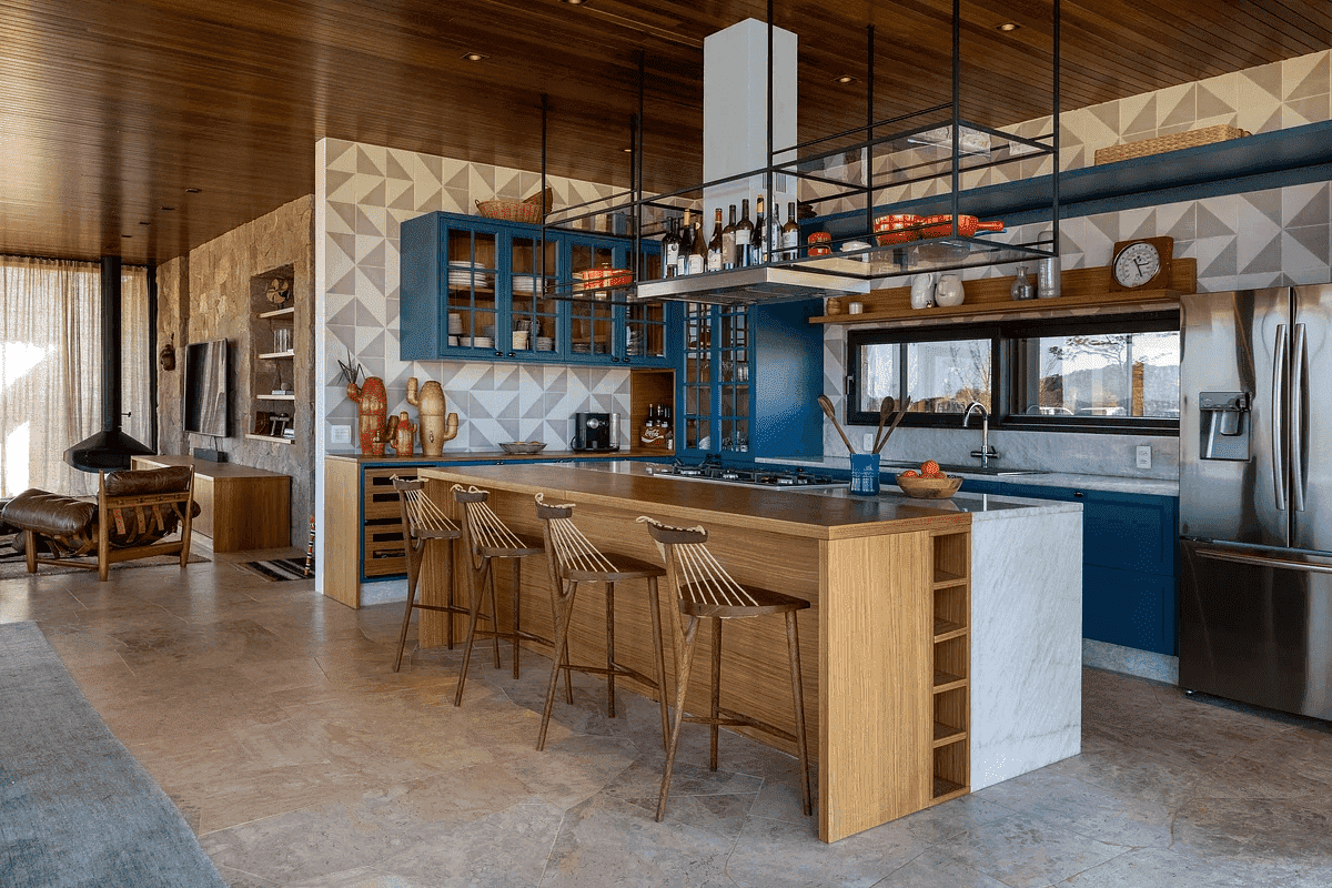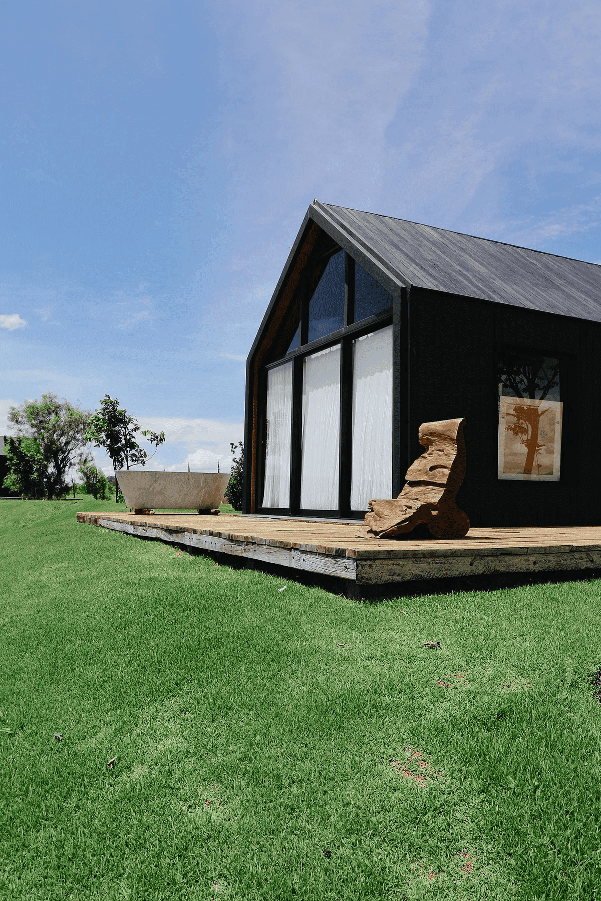 A Casa Principal possui sala de jantar e cozinha integradas e sete suítes, sendo uma delas para crianças. O projeto externo ainda inclui duas cabanas com uma suíte cada; já a sétima suíte é na Casa Pedra, que fica mais reservada. Além disso, há lagos, piscina com móveis assinados por Nanni Chinellato e uma área gourmet com forno a lenha, quadra de beach tennis, mesa de ping pong e um grande balanço para completar a área de lazer e entretenimento.