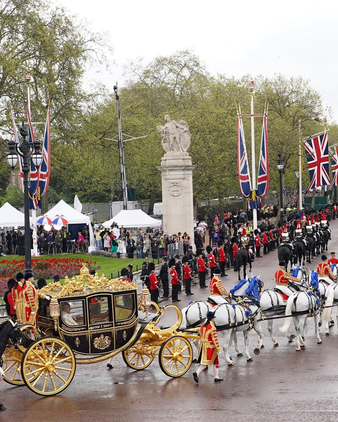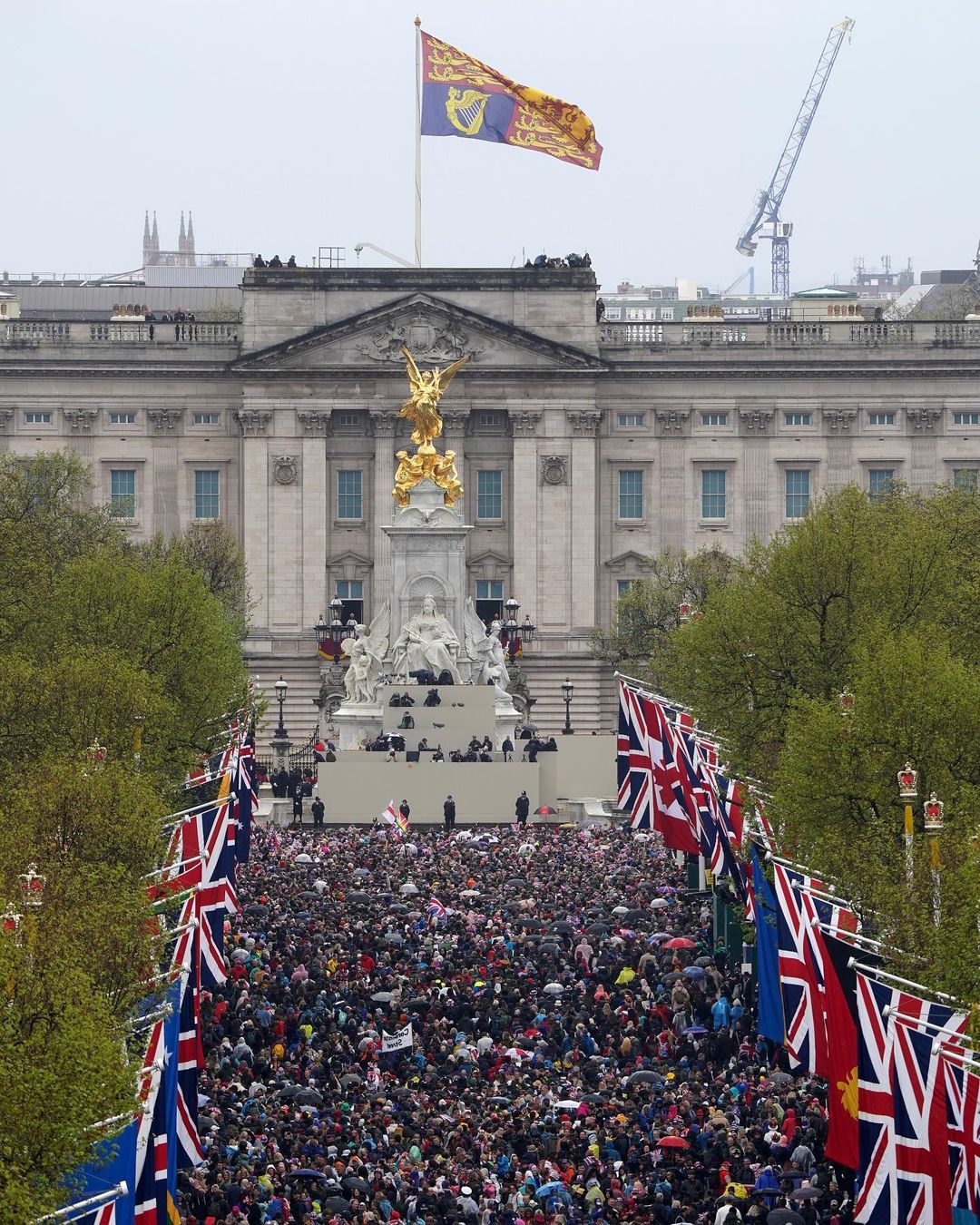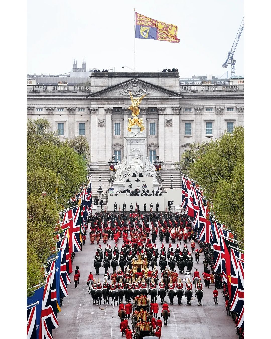 No momento da coroação do rei Charles III, uma saudação de 62 tiros foi disparada na Torre de Londres, com uma salva de seis tiros no Horse Guards Parade. Ao fim da Procissão de Coroação, o rei e a rainha fizeram uma aparição na varanda do Palácio de Buckingham. Em seguida, a Força Aérea Real fez uma apresentação nos céus de Londres.