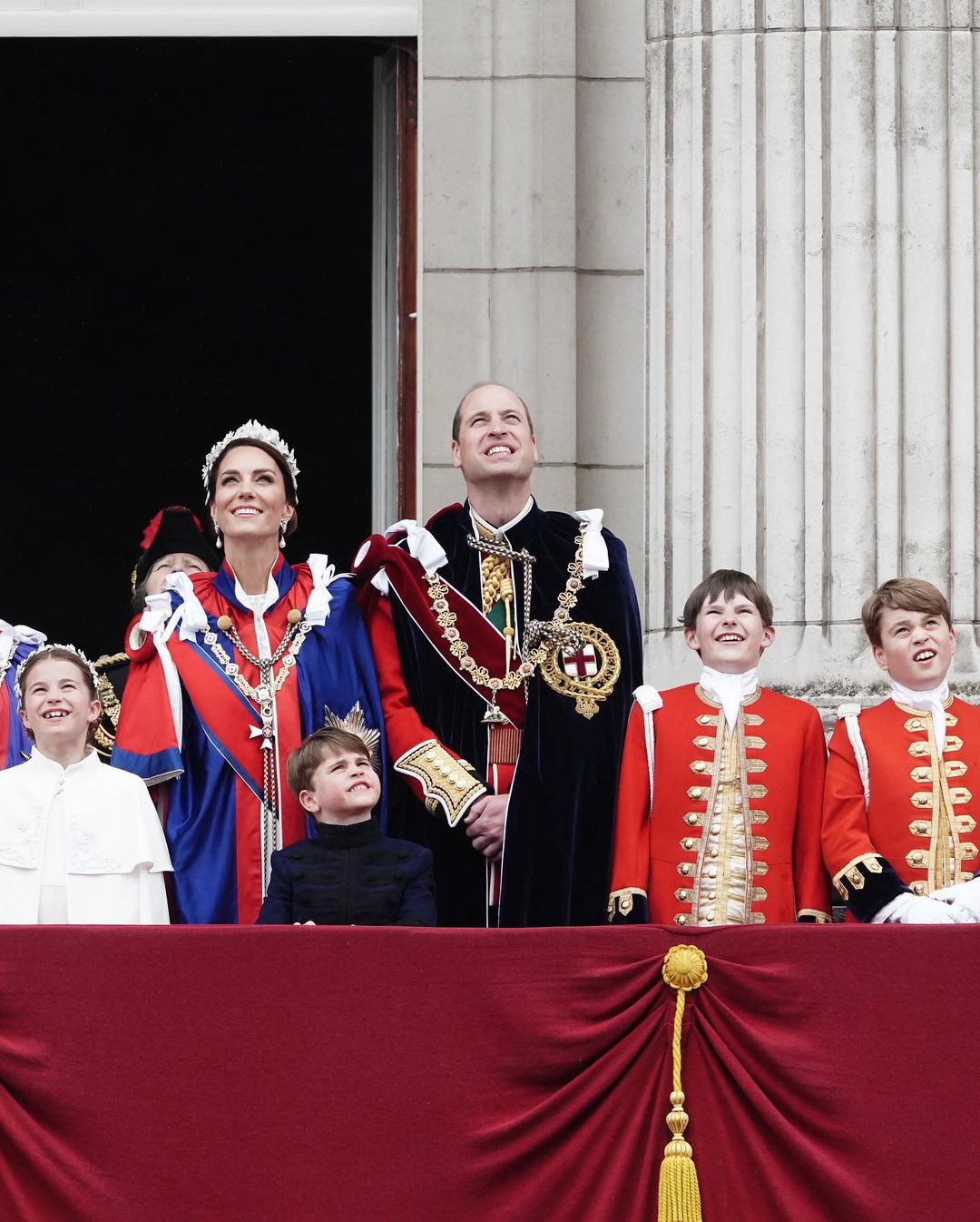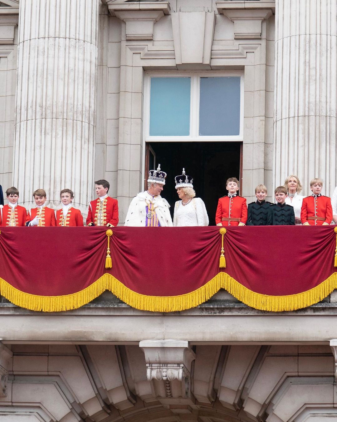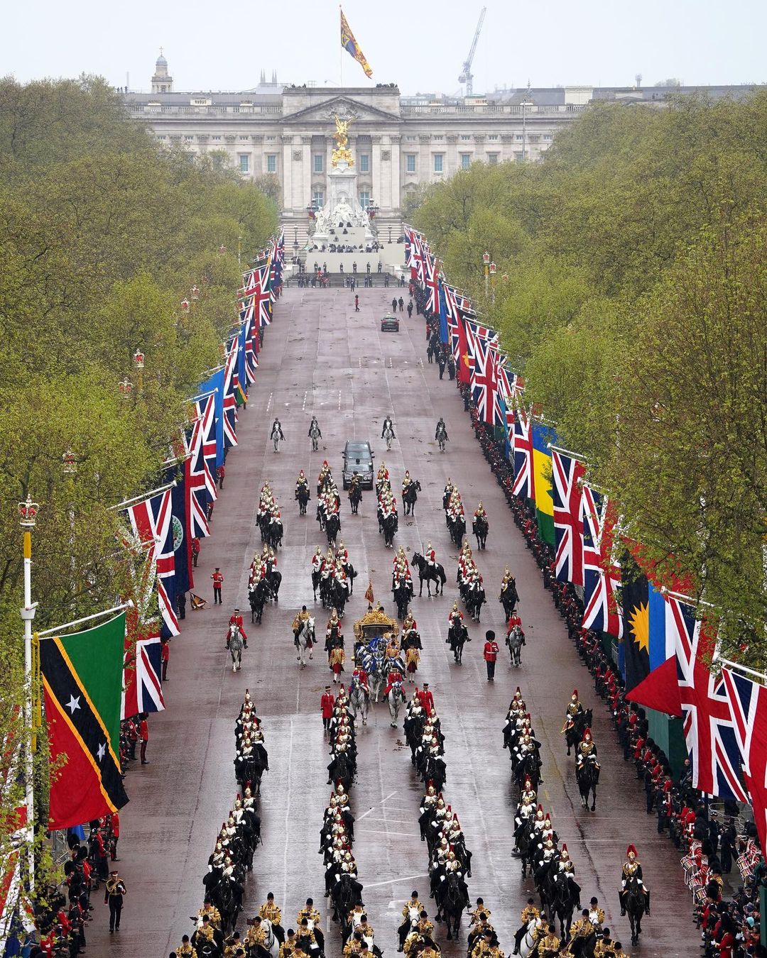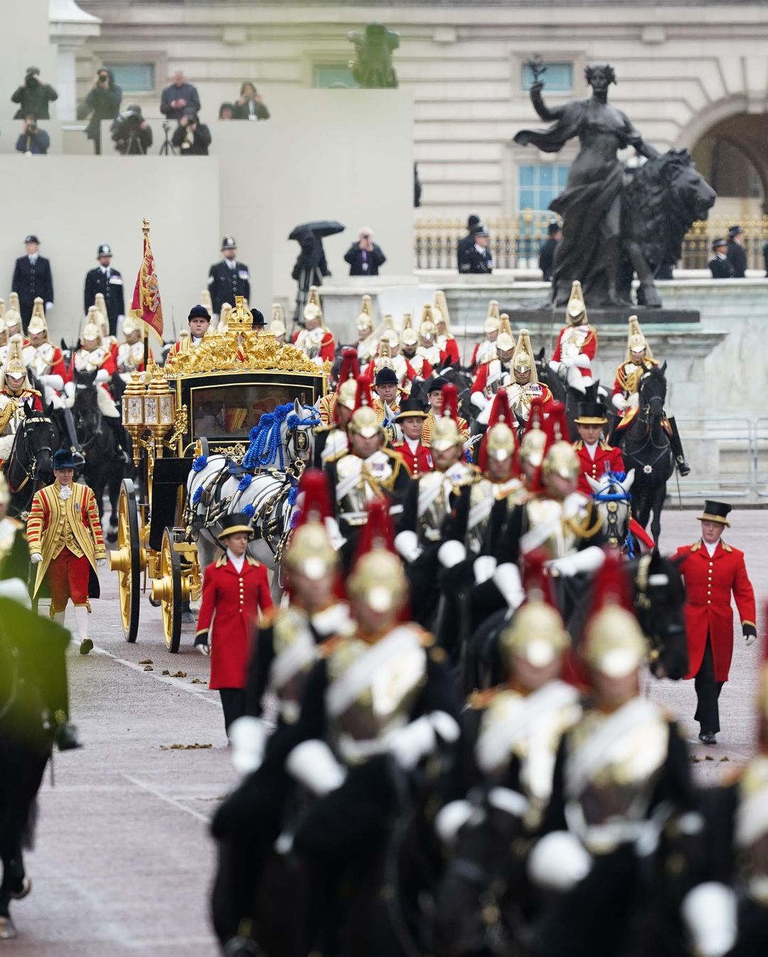 No momento da coroação do rei Charles III, uma saudação de 62 tiros foi disparada na Torre de Londres, com uma salva de seis tiros no Horse Guards Parade. Ao fim da Procissão de Coroação, o rei e a rainha fizeram uma aparição na varanda do Palácio de Buckingham. Em seguida, a Força Aérea Real fez uma apresentação nos céus de Londres.